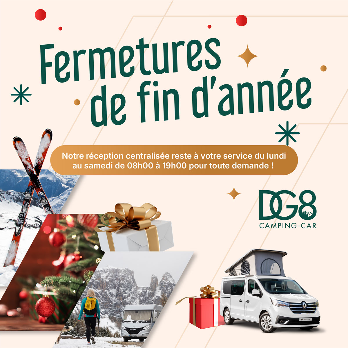 À l’approche de la fin de l’année 2025, l'ensemble des équipes du groupe DG8 CAMPING-CAR souhaite vous remercier pour la confiance que vous nous accordez et pour votre fidélité, qui nous encouragent chaque jour à vous offrir le meilleur de nos services et de notre expertise.