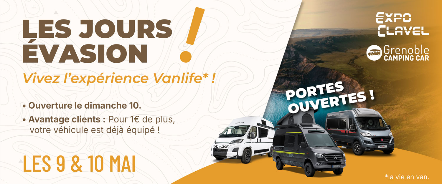 Et si vous preniez la route à bord d'un van ou d'un fourgon aménagé ? Samedi 9 et dimanche 10 mai, nos concessions Expo Clavel et Grenoble Camping-car passent en mode Vanlife ! Une nouvelle façon de vivre la route, où chaque destination devient une expérience unique.