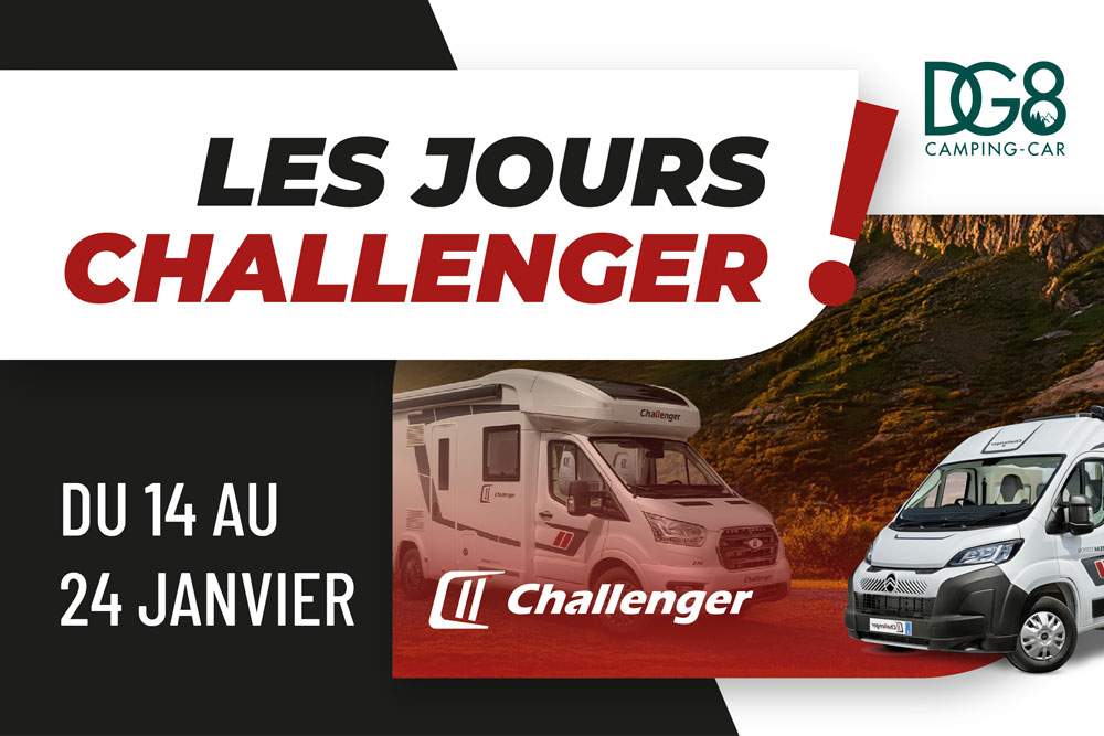Les jours Challenger, c'est du 14 au 24 janvier dans la concession DG8 Camping-car proche de chez vous ! 10 jours pour profiter d'une offre accessoire exclusive pour tout achat d'un véhicule neuf.