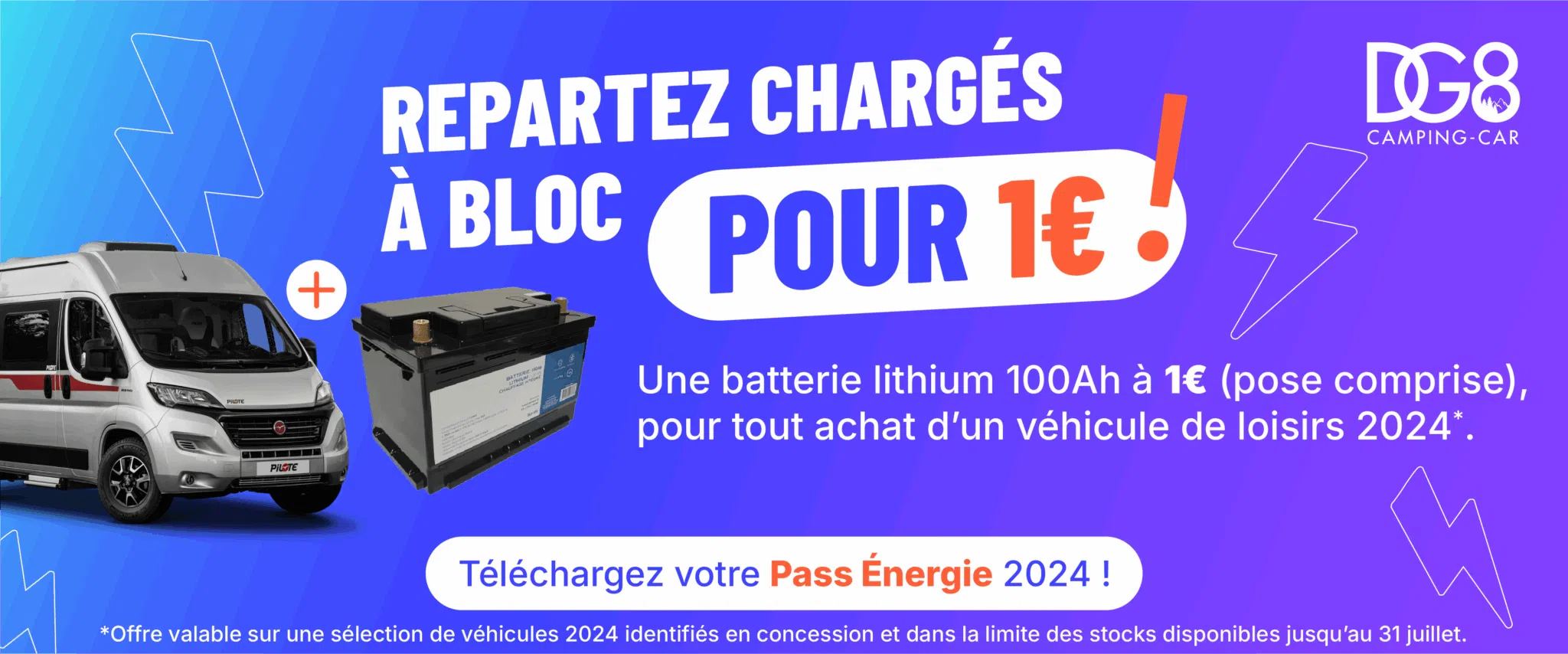 Vous rêvez de voyager sans contraintes et avec une autonomie maximale ? Chez DG8 CAMPING-CAR jusqu'au 31 juillet, pour toute acquisition d’un véhicule de loisirs neuf collection 2024*, bénéficiez d’une batterie lithium à seulement 1 € pose comprise. C’est le moment idéal pour concrétiser votre projet et prendre la route !