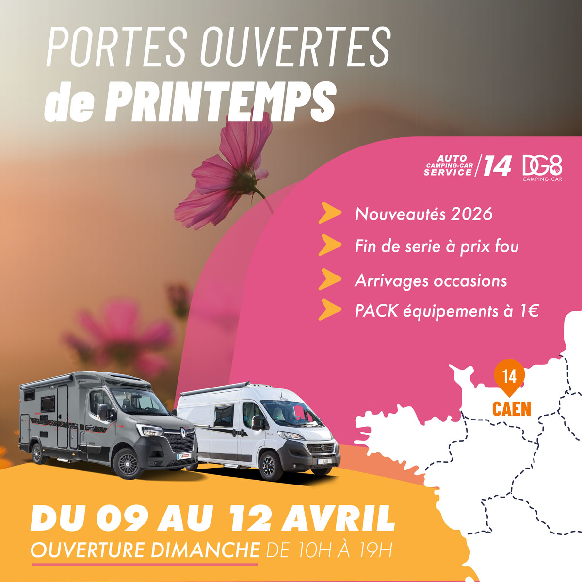 À cette occasion, l'équipe d'Auto Camping-car Service vous invite à vivre un moment privilégié lors de ses portes ouvertes de printemps, du 09 au 12 avril. Pendant 4 jours, profitez d’offres uniques et d’un large choix de véhicules adaptés à toutes vos envies d’évasion.
